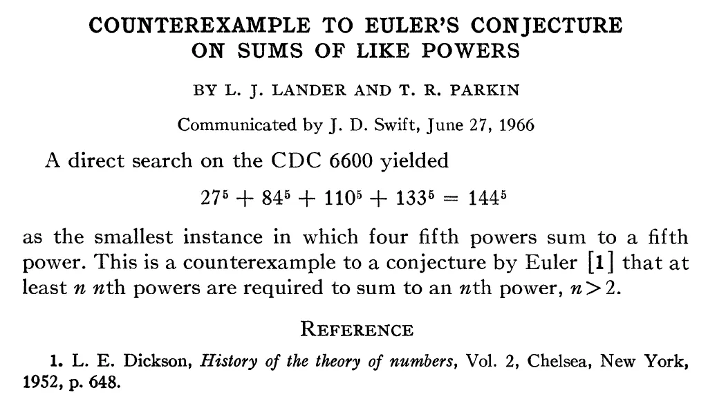 Translation: “Hey Euler, we just found a fifth power using only four fifth powers. Your theory’s toast. Q.E.D.“